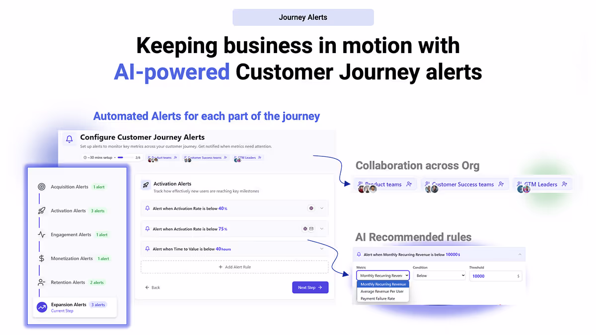 Add Net Retention Revenue (NRR) 2-3x+ faster by retention and expansion plays. Stop Churn before it happens, Find expansion signals.