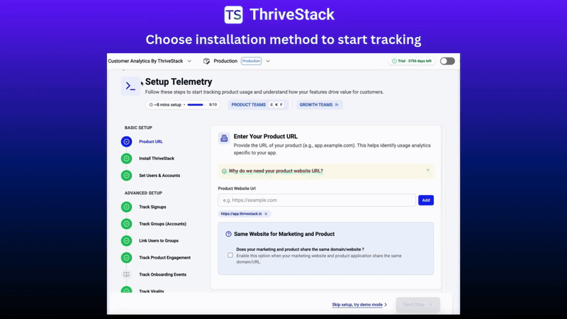 Previously, teams integrated ThriveStack primarily through a JavaScript snippet. With today’s release, customers now setup Product telemetry within their app using:
